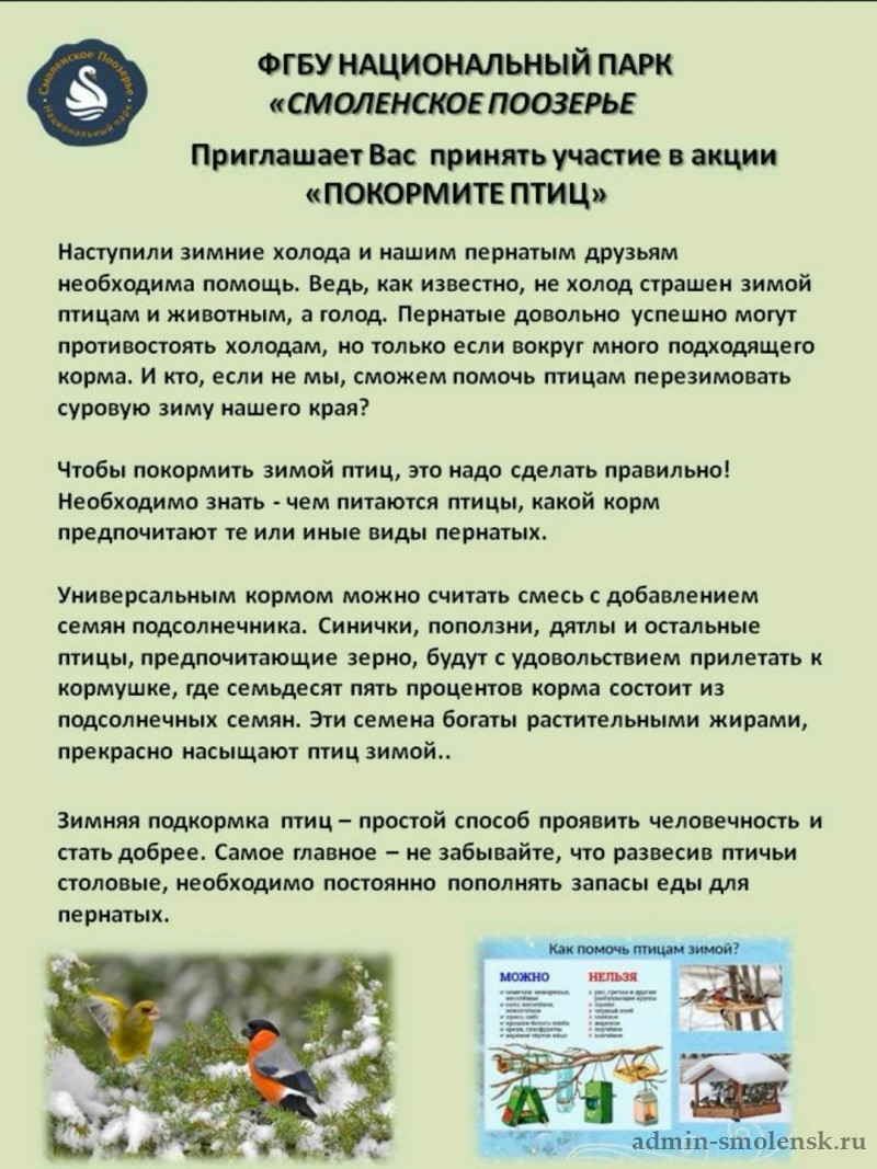 ФГБУ «Национальный парк «Смоленское Поозерье» совместно с Министерством образования и науки Смоленской области приглашает всех принять участие во Всероссийской природоохранной акции «Покормите птиц!».