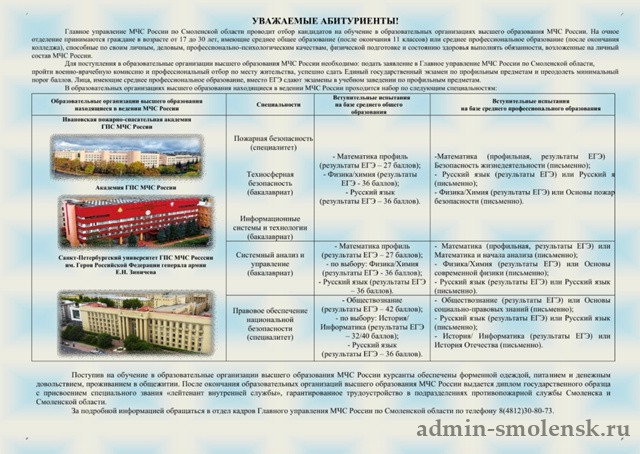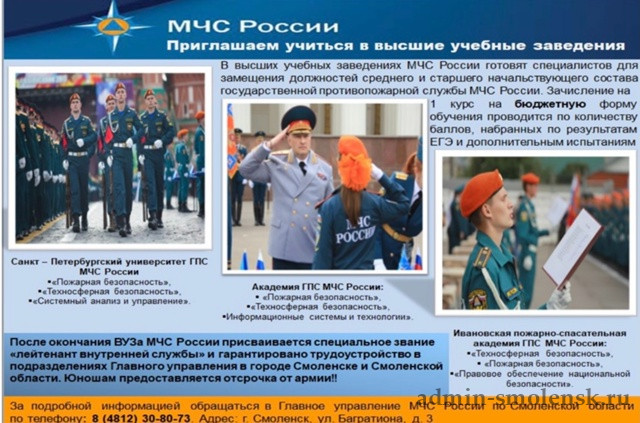 Главное управление МЧС России по Смоленской области приглашает на обучение в ВУЗы МЧС России: