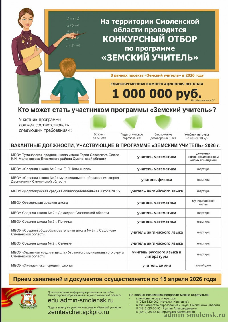 Прием заявок и документов на участие в программе «Земский учитель» осуществляется по 15 апреля 2026 года включительно.