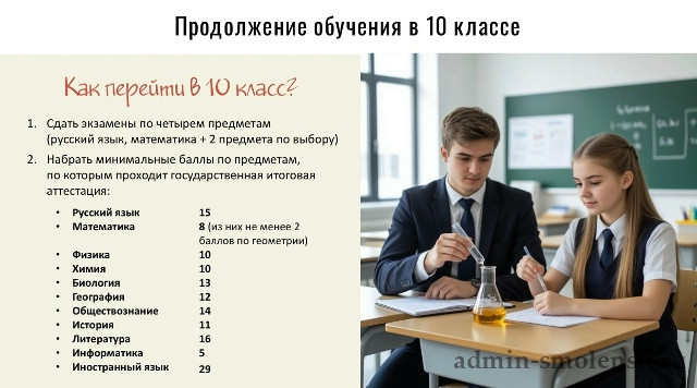 Для этого также необходимо сдать государственную итоговую аттестацию по 4 предметам и набрать минимальные баллы, необходимые для зачисления в 10 класс.