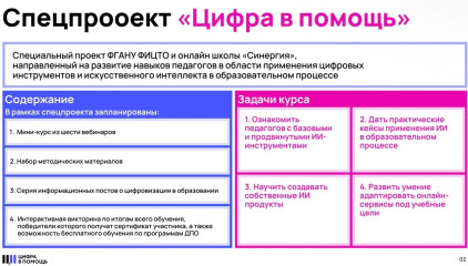 Проект направлен на развитие навыков педагогов школ в области применения цифровых инструментов и искусственного интеллекта в образовательном процессе.