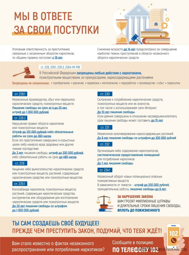 Предлагаем Вашему вниманию информационные материалы, которые помогут избежать совершения необдуманных поступков, правонарушений и преступлений, а также четко понимать, какая ждет ответственность за преступления, связанные с незаконным оборотом наркотиков.